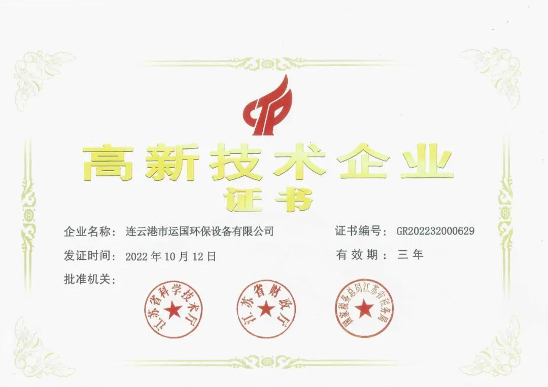 近日,我會副會長單位連云港市運國環保設備有限公司收到由江蘇省科學技術廳、江蘇省財政廳、國家稅務總局江蘇省稅務局頒發的高新技術企業證書。