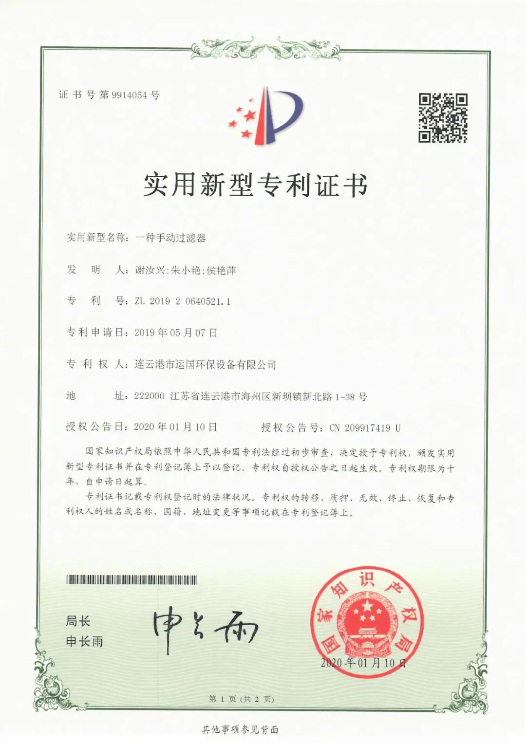 近年來,運國公司在總經理謝汝興的帶領下,勇于創新產品,并與江蘇海洋大學等科研院所合作,先后研發出“一種不銹鋼復合式消音器”、“一種手動過濾器”等10多種獲國家專利、實用新型專利產品。